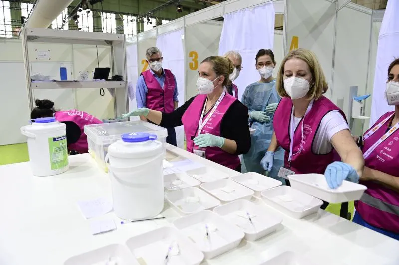 عاملون صحيون يحضرون أطباقاً تحتوي على محاقن مع لقاح ضد فيروس «كورونا» بمركز تطعيم جديد في مطار «تمبلهوف» السابق في برلين (أ.ف.ب)