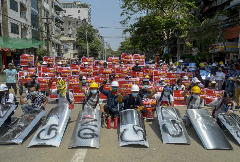 متظاهرون مناهضون للانقلاب العسكري في ميانمار يتجمعون في رانغون (أ.ب)