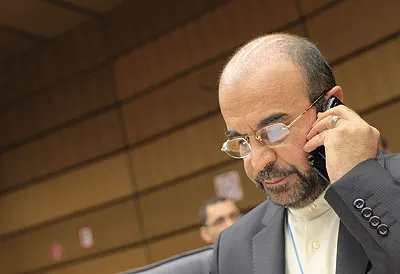 رضا النجفي سفير إيران لدى الوكالة الدولية للطاقة الذرية يجري مكالمة هاتفية خلال اجتماع جرى أمس بمقر المنظمة في فيينا (أ.ف.ب)