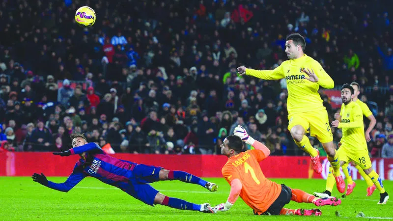 نيمار نجم برشلونة في مواجهة حارس ودفاع فيا ريال في الدوري الإسباني الأسبوع الماضي (أ.ب)