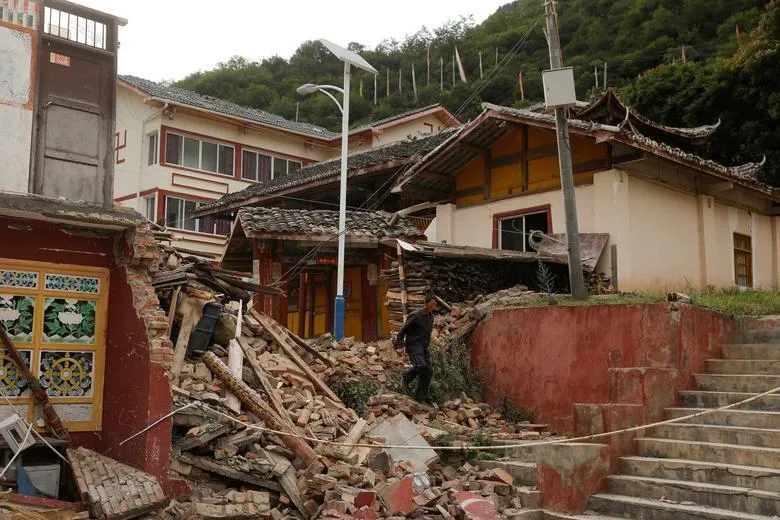 رجل يسير عبر حطام مبنى تضرر جراء زلزال قرب معبد في مقاطعة سيتشوان الصينية (أرشيفية - رويترز)