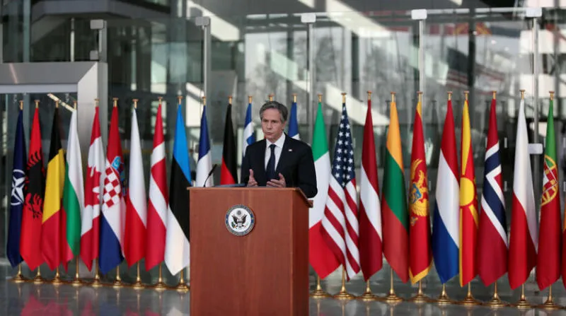 وزير الخارجية الأميركي أنتوني بلينكن خلال مؤتمر صحافي على هامش اجتماع وزراء خارجية حلف الشمال الأطلسي ( الناتو) في بروكسل أمس (رويترز)
