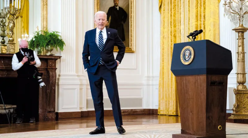أطلق الرئيس الأميركي جو بايدن في أول مؤتمر صحافي له منذ توليه الإدارة الجديدة قبل ما يزيد عن شهرين سهام انتقاداته إلى الإدارة السابقة في ملفات متعلقة بالهجرة والصين وكوريا الشمالية وأفغانستان. وتفاخر بايدن بنجاحه في تمرير قانون المساعدات الإغاثية لـ«كوفيد 19» البالغة 1.9 تريليون دولار، معلناً هدفاً جديداً، أي توزيع اللقاح ضد الفيروس إلى 200 مليون أميركي خلال المائة يوم الأولى من ولايته، بدلاً من هدفه السابق بتطعيم 100 مليون خلال الفترة نفسها. كما أشار إلى نيته الترشح لولاية ثانية في عام 2024. واعترف الرئيس الأميركي خلال المؤتمر الذي استمر لمدة ساعة مساء أمس (الخميس)، بصعوبة الالتزام بموعد الأول من مايو (أيار) للانسحاب من أفغانستان قائلاً إنه من الصعب وضع موعد نهائي للانسحاب لتنفيذ الاتفاق الذي أبرمه الرئيس السابق دونالد ترمب لأسباب تقنية. وقال إن وزير الخارجية بلينكن يقوم حالياً بالتشاور مع الحلفاء في حلف شمال الأطلسي (الناتو) حول كيفية المضي قدماً في أفغانستان، وقال: «ليس في نيتي البقاء طويلاً ولكن السؤال ليس متى سنغادر، وإنما كيف سنغادر، وبأي طريقة آمنة، لكن سنعمل على تحديد موعد لذلك».