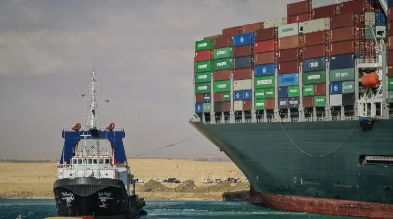 قاطرة تشارك في محاولات تعويم سفينة الحاويات «إيفر غيفن» الجانحة بقناة السويس (د.ب.أ)