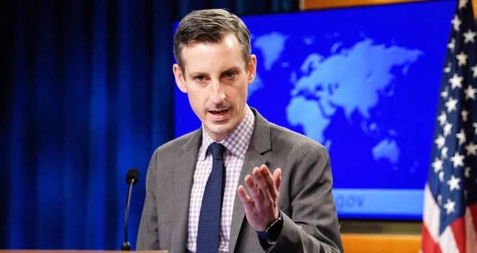 صورة من المؤتمر الصحافي للمتحدث الرسمي لوزارة الخارجية نيد برايس (أ.ف.ب)