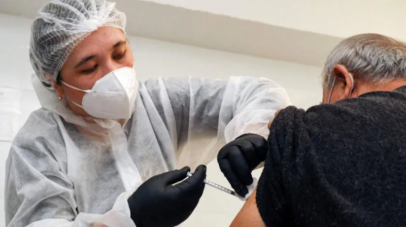مسن يتلقى لقاح «أسترازينيكا» في أوزباكستان أمس (أ.ف.ب)