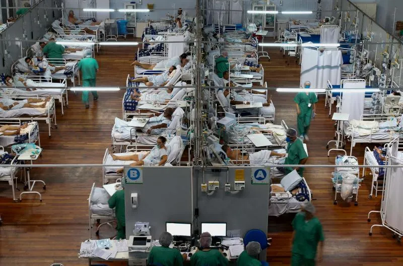 مرضى بكورونا في مستشفى بُنيت في صالة ألعاب رياضية بولاية ساو باولو البرازيلية (أ.ف.ب)