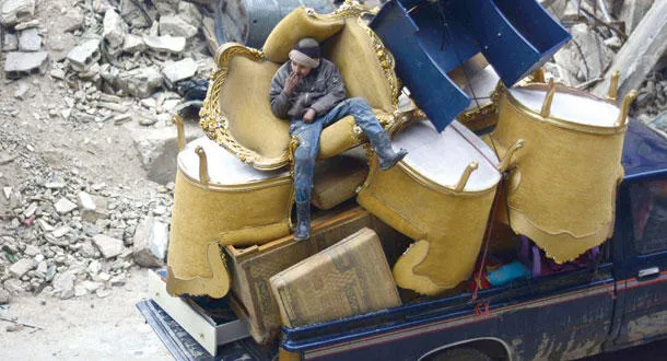 طفل سوري في شاحنة محملة بالأثاث الذي أخلته أسرته من منزلها في دوما شمال شرق دمشق أول من أمس (أ.ف.ب)