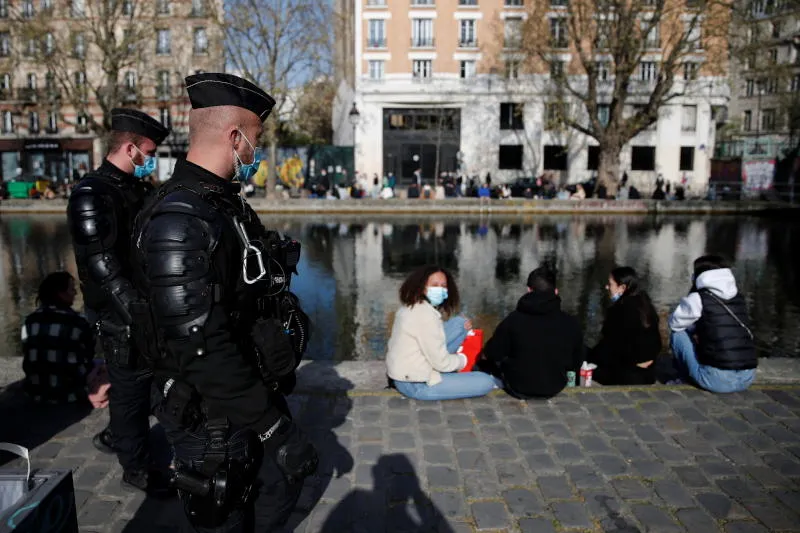 ضباط شرطة يراقبون أشخاصاً على ضفاف قناة سان مارتن للتأكد من تطبيق قواعد مكافحة كورونا (رويترز)