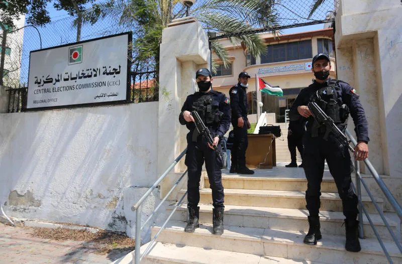رجال الشرطة يقفون حراسة خارج مبنى لجنة الانتخابات في غزة (د.ب.أ)