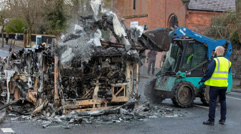 حافلة حُرقت في منطقة البروتستانت الوحدويين الموالين لبريطانيا (أ.ف.ب)