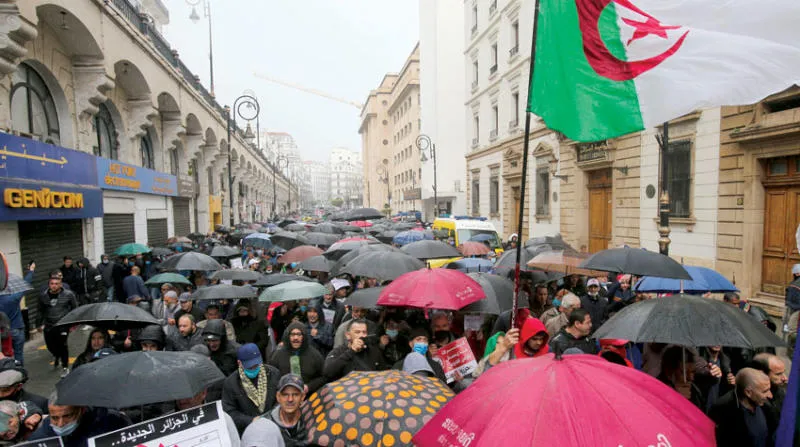 لم تمنع الأمطار وانخفاض درجات الحرارة، أمس، الجزائريين من الخروج إلى شوارع العاصمة والمدن الكبيرة تأكيداً على تمسكهم بمطالب الحراك الشعبي، وأهمها «تغيير النظام جذرياً» و«بناء دولة مدنية لا يحكمها العسكر». وعبر الآلاف من المتظاهرين في الأسبوع 113 من الاحتجاجات الشعبية، عن تضامن كبير مع 23 معتقلاً مضربين في السجون منذ 10 أيام.