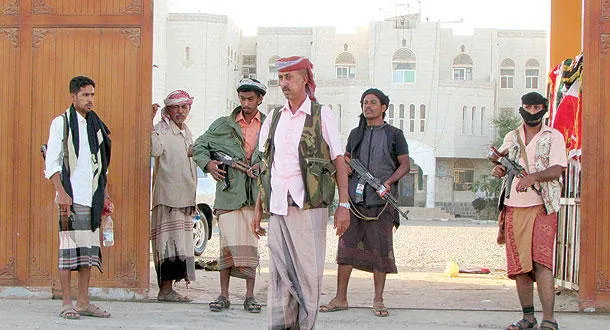 عناصر من شباب الحراك الجنوبي يحرسون إحدى المنشآت الرسمية بعد استرجاعها من الحوثيين أول من أمس في عدن (رويترز)
