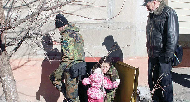 امرأة تغادر مع صغيرها ملجأ في إطار تدريب على الاختباء في حال سقوط قذائف في ماريوبول بجنوب شرق أوكرانيا أمس (ا.ب.ا)