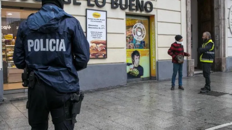 شرطي في مدينة سرقسطة (شمال شرق) الإسبانية يسأل رجلاً عن سبب وجوده في الشارع (إ.ب.أ)