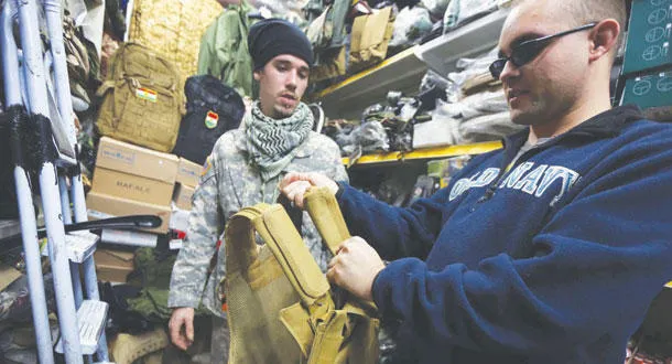 الأميركي لويس بارك ومواطنه (ل) المتطوعان للقتال ضمن مجموعة من المسيحيين العراقيين للقتال ضد «داعش» يعاينان بعض الملابس العسكرية في محل بمدينة دهوك أول من أمس (أ.ف.ب)