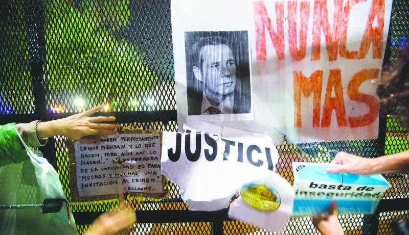 متظاهرون أرجنتينيون يعلقون ملصقات على حاجز في نهاية مسيرة نظمها في بوينس أيرس اتحاد المدعين العامين للمطالبة بكشف ملابسات وفاة زميل لهم في المهنة بعد مرور شهر على وفاته (أ.ب)
