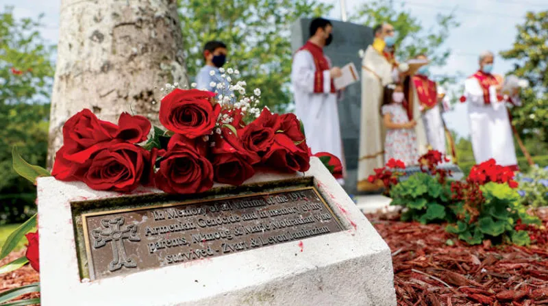 أميركيون من أصل أرمني يضعون الزهور على نصب تذكارية لضحايا الإبادة مطلع القرن الماضي (أ.ب)