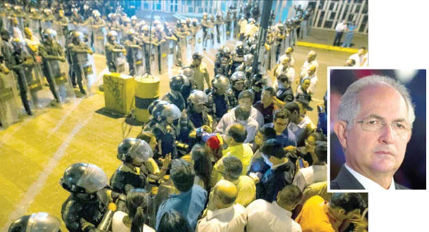 الشرطة تحرس مقر الاستخبارات في العاصمة الفنزويلية بعد اعتقال رئيس بلدية كاراكاس المعارض أنطونيو ليديزما (صاحب الصورة في الإطار) مساء أول من أمس (إ.ب.أ)