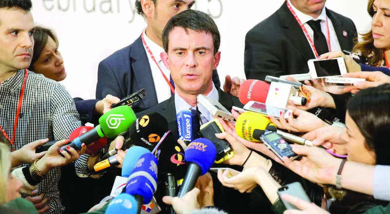 رئيس الوزراء الفرنسي مانويل فالس يواجه وسائل الإعلام على هامش مؤتمر الاشتراكيين الديمقراطيين الأوروبيين أمس في مدريد (رويترز)