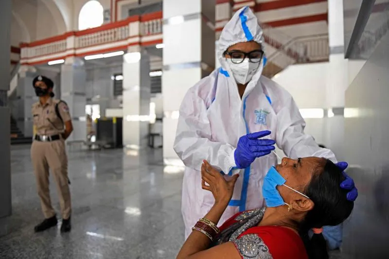 امرأة تخضع لاختبار الكشف عن فيروس كورونا في الهند (أ.ف.ب)