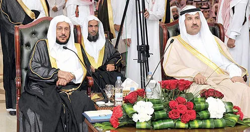 الأمير فيصل بن سلمان أمير المدينة المنورة والشيخ الدكتور عبداللطيف آل الشيخ الرئيس العام لهيئة الأمر بالمعروف والنهي عن المنكر لدى افتتاح الدورة التدريبية في المدينة المنورة مساء أول أمس (واس)