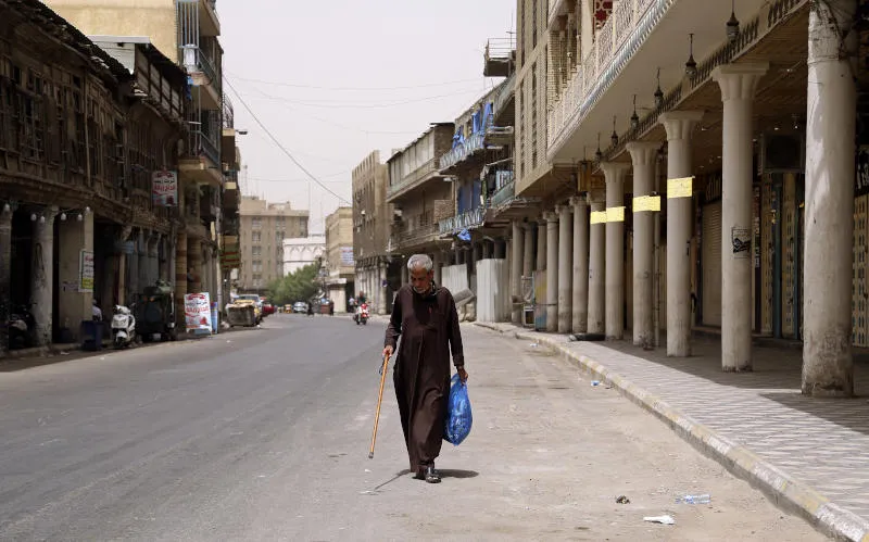 رجل يسير في شارع تجاري فارغ بسبب انتشار فيروس كورونا في وسط بغداد (أ.ب)