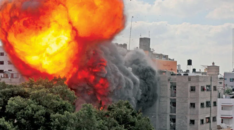 كرة من النار تنطلق من مبنى الوليد في غزة أمس بعد استهداف إسرائيل (أ.ف.ب)