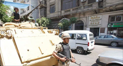 جندي في نوبة حراسة أمام عربة مدرعة بالقرب من مسجد الفتح في ميدان رمسيس بوسط القاهرة أمس (رويترز)