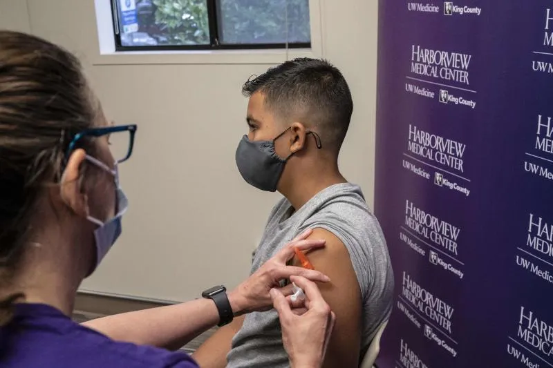 شاب يحصل على لقاح «فايزر - بيونتيك» في مدينة سياتل الأميركية (أ.ف.ب)