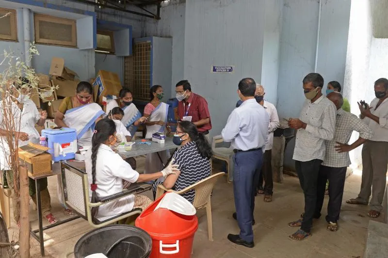 اشخاص يصطفون في طوابير ويسجلون أنفسهم للحصول على لقاح فيروس كورونا بمركز للرعاية الصحية الأولية بحيدر آباد (ا.ف.ب)
