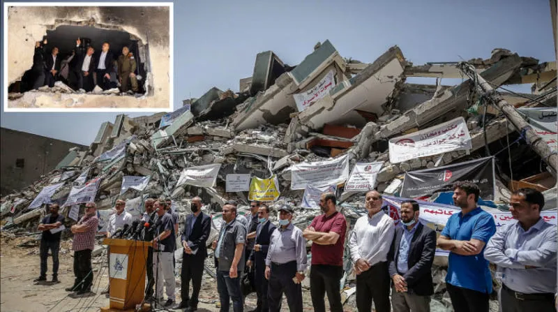 وفد أوروبي خلال زيارته أمس «برج الجلاء» الذي دمرته إسرائيل في غزة (إ.ب.أ) وفي الإطار وفد مماثل خلال زيارته منزلاً أصيب بصاروخ أطلق من غزة على بلدة تباح تكفا في شمال إسرائيل (أ.ب)