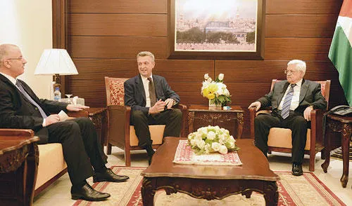 الرئيس الفلسطيني محمود عباس يستقبل المفوض العام لـ«أونروا» فيليبو غراندي بحضور رئيس الوزراء رامي حمد الله في رام الله أمس (أ.ف.ب)