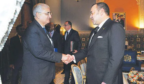 الملك محمد السادس لدى استقباله وزير الخارجية الهندي سلمان خورشيد في مراكش مساء أول من أمس (أ. ف. ب)
