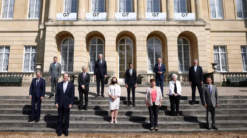 صورة جماعية للمشاركين في اجتماع وزراء مالية «مجموعة السبع» في لندن أمس بعد توصلهم إلى اتفاق وصف بـ«التاريخي» لإصلاح النظام الضريبي العالمي وإلزام شركات التكنولوجيا دفع الضرائب (أ.ف.ب)