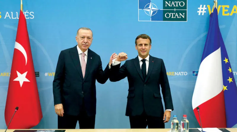 جانب من لقاء الرئيسين الفرنسي والتركي في قمة الناتو ببروكسل أول من أمس (أ.ف.ب)