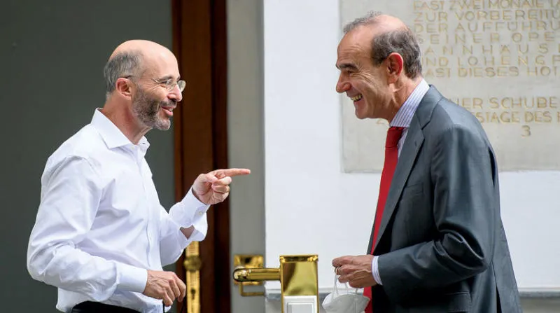 المبعوث الأميركي الخاص بإيران روبرت مالي يتحدث لمبعوث الاتحاد الأوروبي ومنسق محادثات إحياء الاتفاق النووي إنريكي مورا في فيينا أمس (إ.ب.أ)