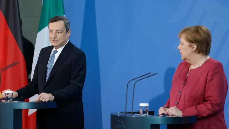 المستشارة الألمانية أنجيلا ميركل مع ماريو دراغي رئيس وزراء إيطاليا في مؤتمر صحافي (أ.ب)