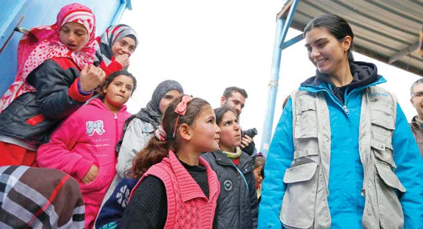 الممثلة التركية توبا بايوكوستون سفيرة النوايا الحسنة لليونيسيف التقت أطفالا سوريين في مخيم الزعتري بالأردن أمس (رويترز)