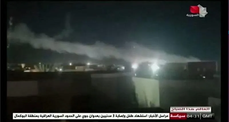 صورة من التلفزيون السوري تُظهر الدخان يتصاعد نتيجة الضربات الجوية الأميركية على الحدود السورية العراقية (أ.ف.ب)