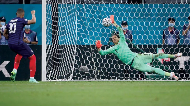 سومر حارس سويسرا يتصدى لركلة الترجيح التي سددها مبابي ليمنح بلاده بطاقة العبور لربع النهائي (أ.ف.ب)