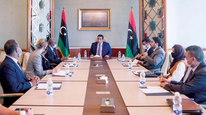رئيس المجلس الرئاسي محمد المنفي يستقبل وفداً أممياً في طرابلس أمس (المكتب الإعلامي للمجلس الرئاسي)