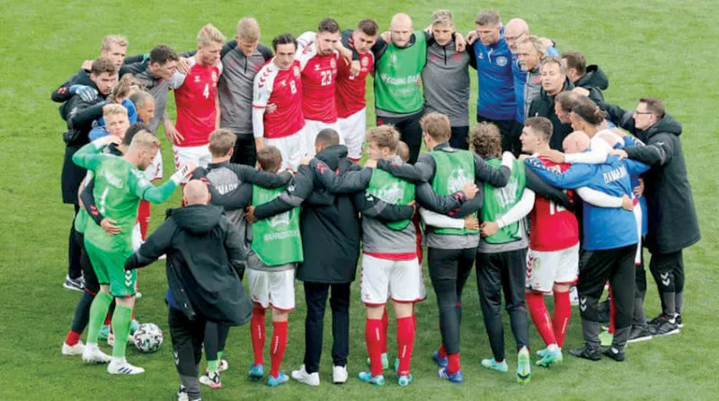 لاعبو الدنمارك قبل استئناف اللعب أمام فنلندا بعد سقوط إريكسن فجأة (غيتي)