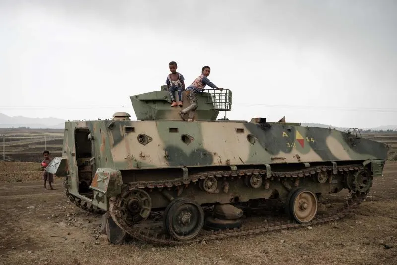 أطفال يلعبون على دبابة تابعة للقوات الحكومية الإثيوبية بالقرب من ميكيلي (أ.ف.ب)