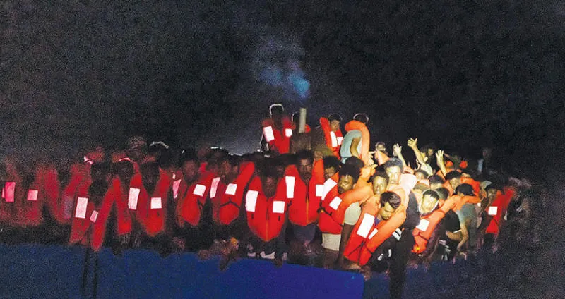 صورة وزعتها منظمة «إس أو إس المتوسط» لمهاجرين أنقذتهم السفينة «أوشن فايكينغ» في البحر المتوسط ليل الأحد - الاثنين (د.ب.أ)