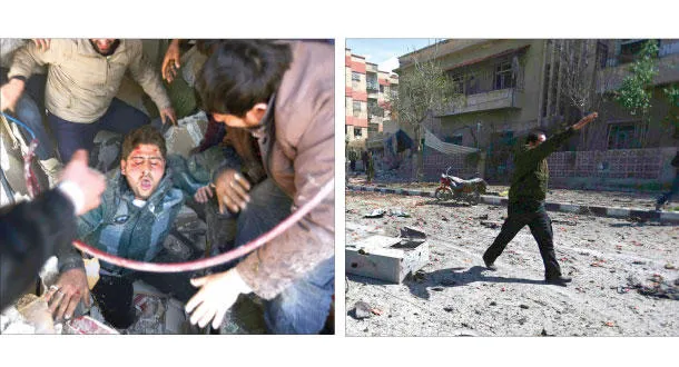 سوريون يتفقدون موقعا قصفته قوات النظام السوري في دوما بالغوطة الشرقية قرب العاصمة دمشق أمس (رويترز)، محاولات لإنقاذ رجل من تحت الأنقاض جراء غارة جوية شنتها القوات الموالية