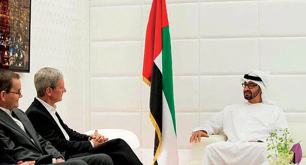 الشيخ محمد بن زايد خلال استقباله رئيس شركة «أبل» الأميركية في أبوظبي أمس (وام)