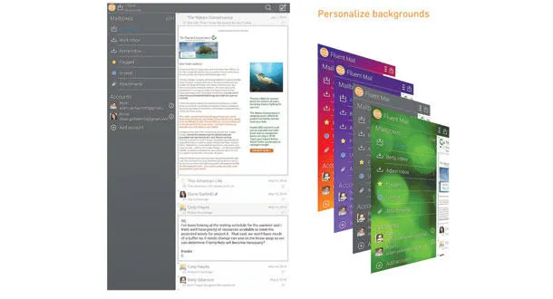 * يقدم لك تطبيق «فلوينت ميل» Fluent Mail المجاني على الأجهزة التي تعمل بنظام التشغيل «آندرويد» القدرة على معاينة الكثير من حسابات البريد الإلكتروني الخاصة بك بلمسة واحدة. ويمكنك بهذه الطريقة التواصل مع الآخرين من خلال بريدك الإلكتروني الشخصي والآخر الخاص بالعمل، وغيره، من خلال تطبيق واحد وبلمسات قليلة، مع القدرة على تخصيص إيماءات محددة لتسهيل القيام ببعض المهمات. ويدعم التطبيق خدمات البريد الإلكتروني المعروفة، مثل «جي ميل» و«ياهو ميل» و«آوتلوك» و«آي كلاود»، مع دعمه لتقنيات «آي ماب» IMAP و«بوب 3» POP3 التي تغطي معظم الخدمات الأخرى.