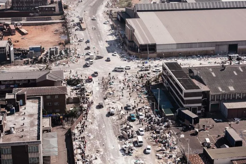 وفي وسط جوهانسبورغ، بقي العديد من المتاجر مغلقة، وقام بعض التجار والموظفين بتنظيف واجهات متاجرهم. كذلك؛ بقيت الشوارع مغلقة بحواجز متفحمة فيما تصاعد الدخان من هياكل سيارات محترقة.