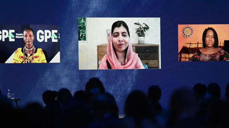 ملالا يوسفزاي تتحدث لدى مشاركتها في قمة التعليم العالمية التي استضافتها لندن أمس (إ.ب.أ)
